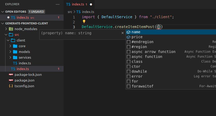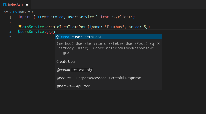 Now you can import and use the client code, it could look like this, notice that you get autocompletion for the methods: